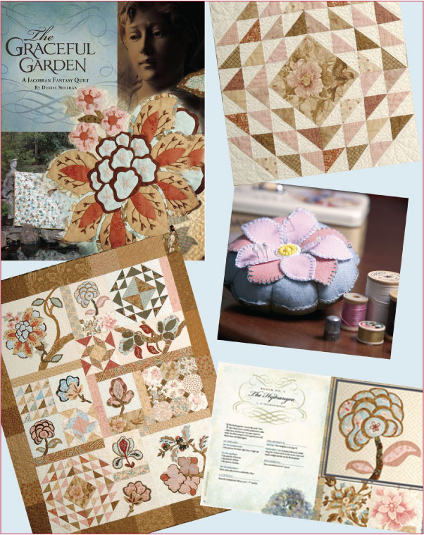 The Graceful Garden is a block-of-the-month quilt featuring appliqué blocks with embroidered accents and complementary pieced blocks inspired by the art of the 17th Century. This fantasy garden’s many details—emulating the Jacobean era—are all created with 21st Century quiltmaking techniques including starch method appliqué and rotary cutting instructions.